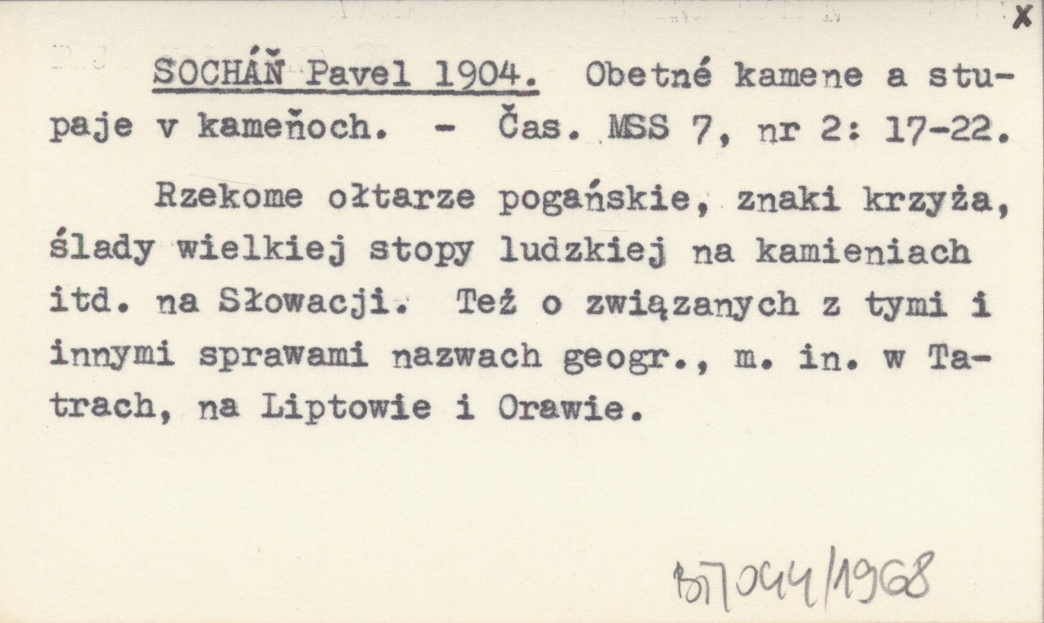 Časopis Muzeálnej Slovenskej Spoločnosti, 7, nr 2: 17-22. Rzekome ołtarze pogańskie, znaki krzyża, ślady wielkiej stopy ludzkiej na kamieniach itd. na Słowacji. Też o związanych z tymi i innymi sprawami nazwach geograficznych, m. in. w Tatrach, na Liptowie i Orawie.