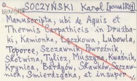 SOCZYŃSKI Karol [przed 1834] Manuscripta, ubi de Aquis et Thermis Carpathicis in Drużbaki, Kamionka, Łączkowa, Lubowla, Toporce, Szczawnik, Powroźnik, Słotwina, Tylicz, Muszyna, Kwaśnik, Krynica, Bardyów, Sławków, Szczawnica, Smierdzącka, et insuper De Thermis in Pisczany, Trenczyn, Łucki, Slacz, Wichnia etc. tractatur.