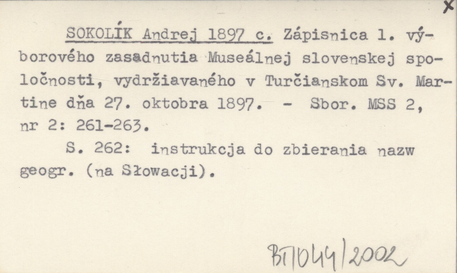 SOKOLÍK Andrej 1897 c Zápisnica 1. výborového zasadnutia Museálnej slovenskej spoločnosti, vydržiavaného v Turčianskom Sv. Martine dňa 27. oktobra 1897.