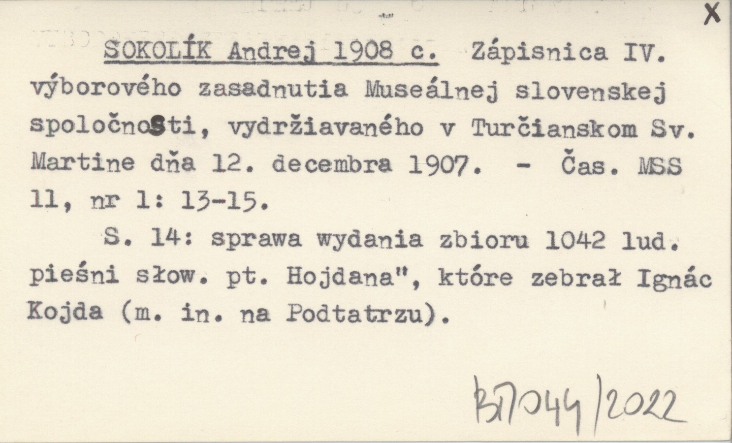 Časopis Muzeálnej Slovenskej Spoločnosti, 11, nr 1: 13-15. S. 14: sprawa wydania zbioru 1042 ludowych pieśni słowackich pt. "Hojdana", które zebrał Ignác Kojda (m. in. na Podtatrzu).