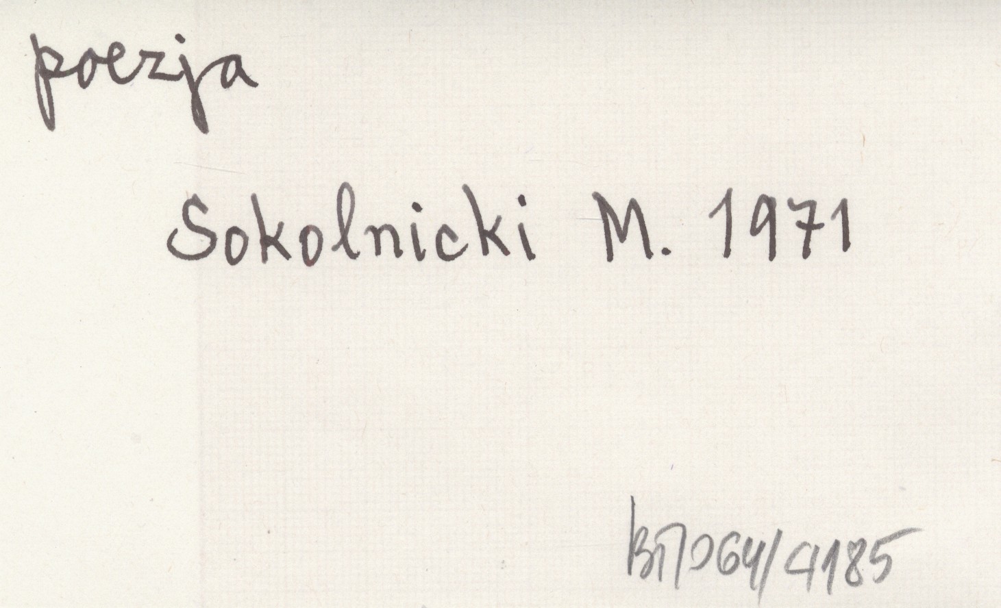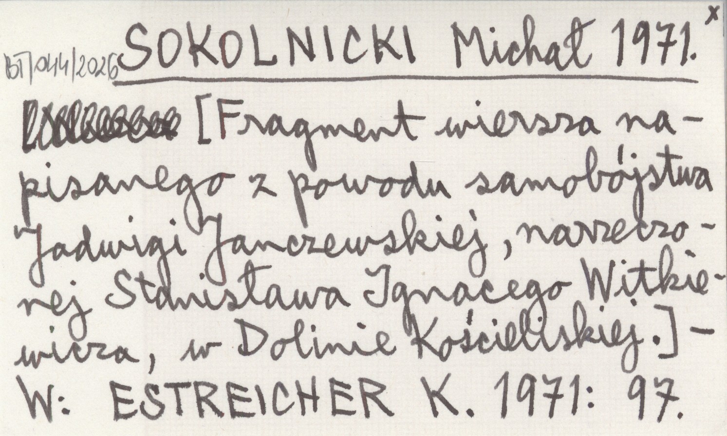 SOKOLNICKI Michał 1971 [Fragment wiersza napisanego z powodu samobójstwa Jadwigi Janczewskiej, narzeczonej Stanisława Ignacego Witkiewicza, w Dolinie Kościeliskiej.]