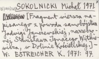 SOKOLNICKI Michał 1971 [Fragment wiersza napisanego z powodu samobójstwa Jadwigi Janczewskiej, narzeczonej Stanisława Ignacego Witkiewicza, w Dolinie Kościeliskiej.]