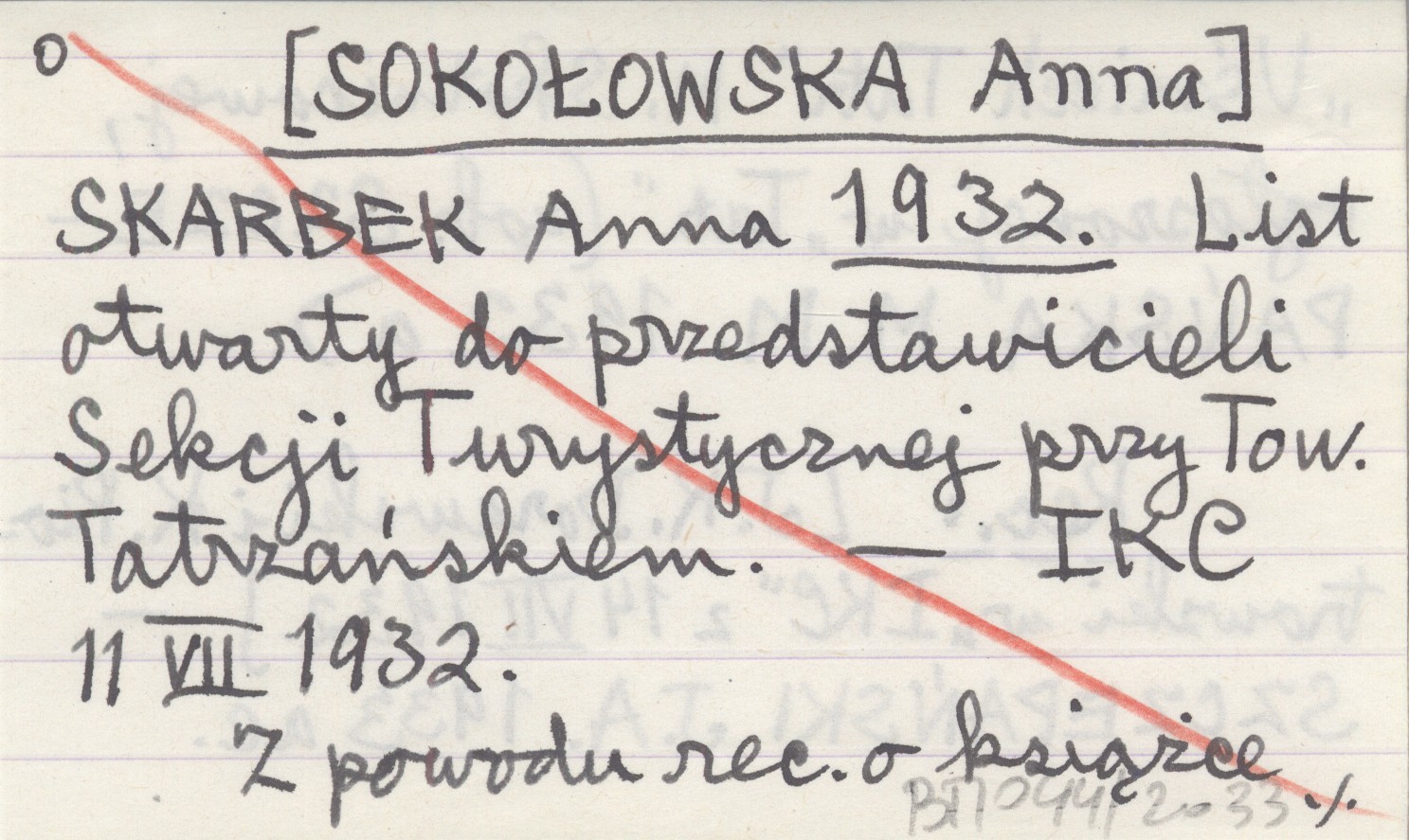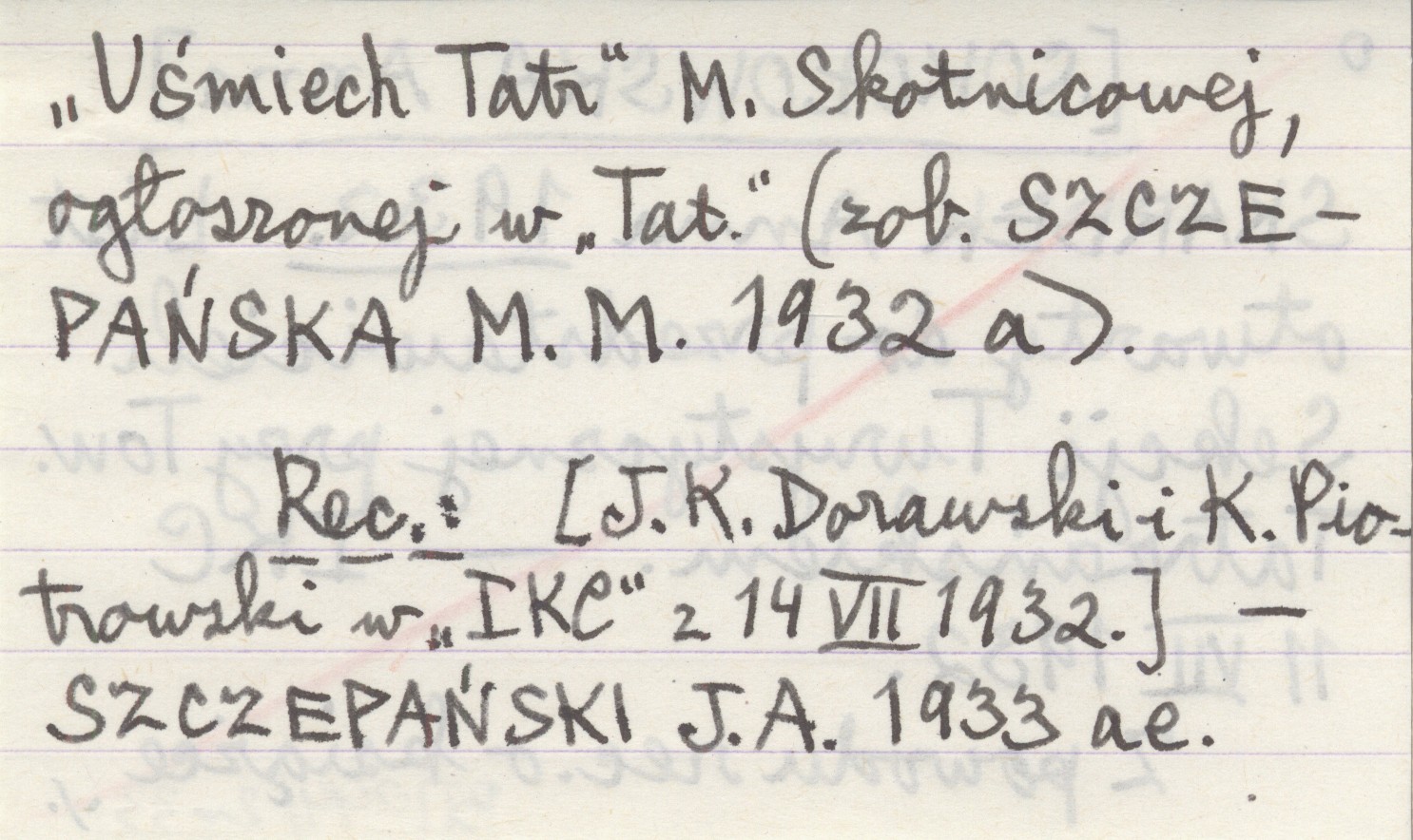 Ilustrowany Kuryer Codzienny, 11 VII 1932. Z powodu recenzji o książce "Uśmiech Tatr" M. Skotnicowej, ogłoszonej w "Taterniku" (zob. SZCZEPAŃSKA M. M. 1932 a). REC: [J. K. DORAWSKI i K. PIOTROWSKI w "Ilustrowany Kuryer Codzienny" z 14 VII 1932] ; SZCZEPAŃSKI J. A. 1933 ae ;
