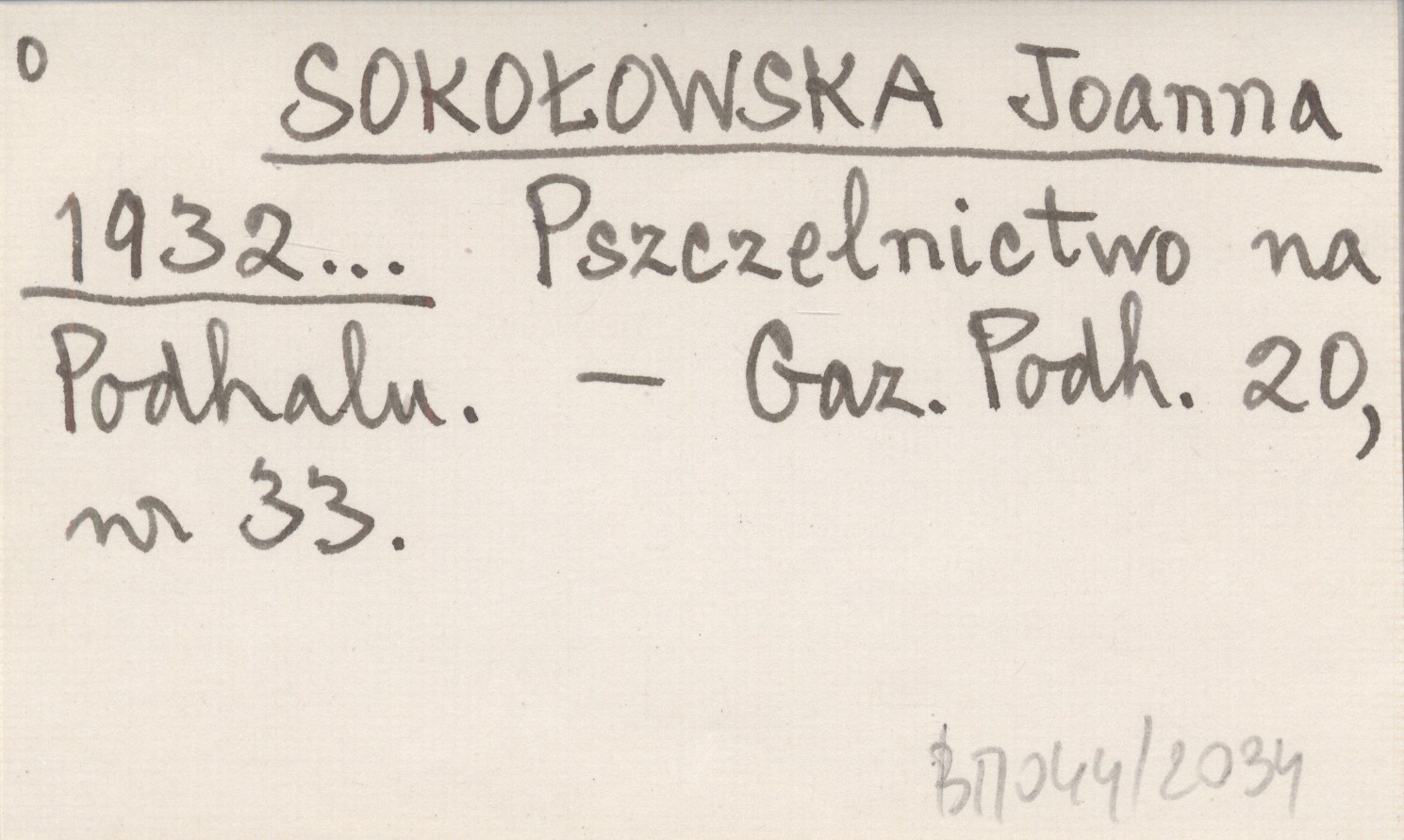 SOKOŁOWSKA Joanna 1932... Pszczelnictwo na Podhalu.
