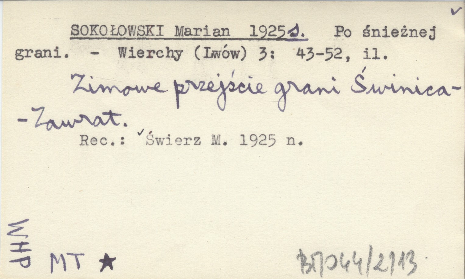 Wierchy (Lwów) , 3: 43-52, il. Zimowe przejście grani Świnica-Zawrat. REC: ŚWIERZ M. 1925 n