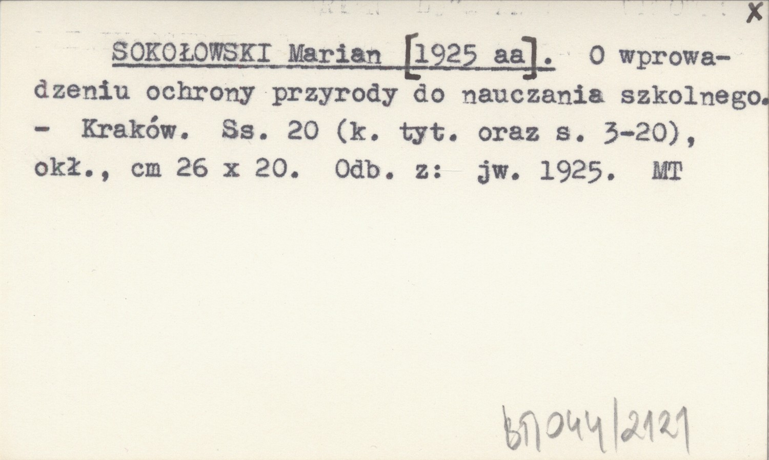 SOKOŁOWSKI Marian [1925 aa O wprowadzeniu ochrony przyrody do nauczania szkolnego.