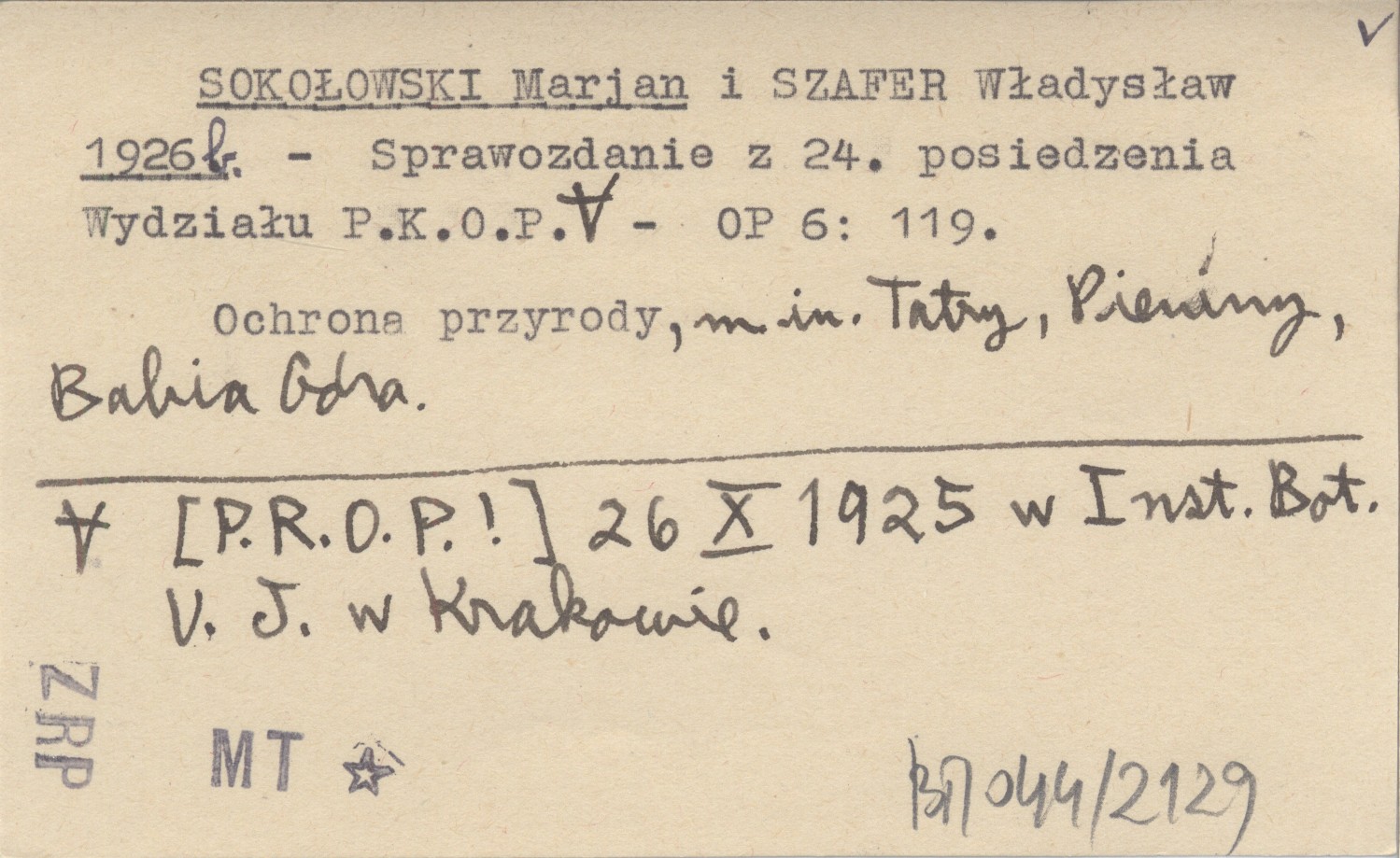 SOKOŁOWSKI Marjan SZAFER, Władysław. ; 1926 b Sprawozdanie z 24. posiedzenia Wydziału P.K.O.P. [P.R.O.P.!] 26 X 1925 w Inst. Bot. U.J. w Krakowie.