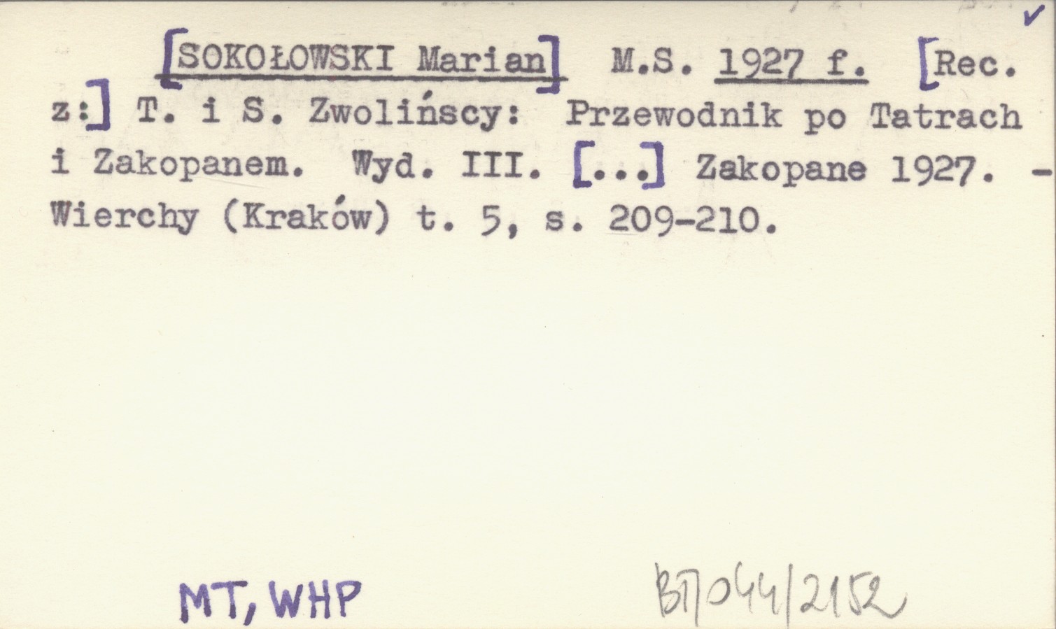 M. S. [SOKOŁOWSKI Marian] 1927 f [Rec. z:] T. i S. Zwolińcy: Przewodnik po Tatrach i Zakopanem. Wyd. III [...] Zakopane 1927.