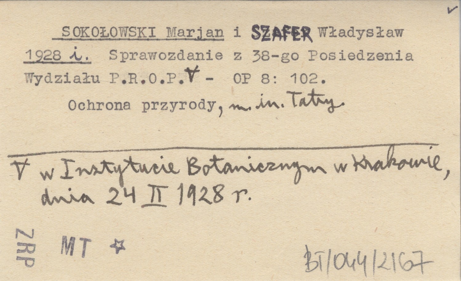 SOKOŁOWSKI Marjan SZAFER, Władysław. ; 1928 i Sprawozdanie z 38-go Posiedzenia Wydziału P.R.O.P. w Instytucie Botanicznym w Krakowie, dnia 24 II 1928 r.