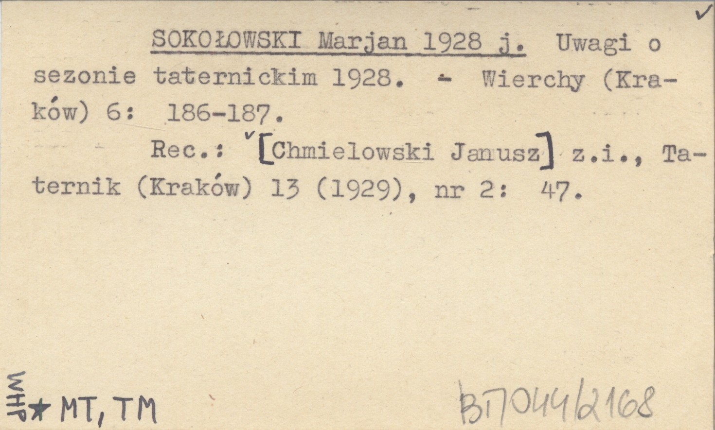 Wierchy (Kraków) , 6: 186-187. REC: [CHMIELOWSKI Janusz] z. i., Taternik (Kraków) 13 (1929), nr 2: 47.