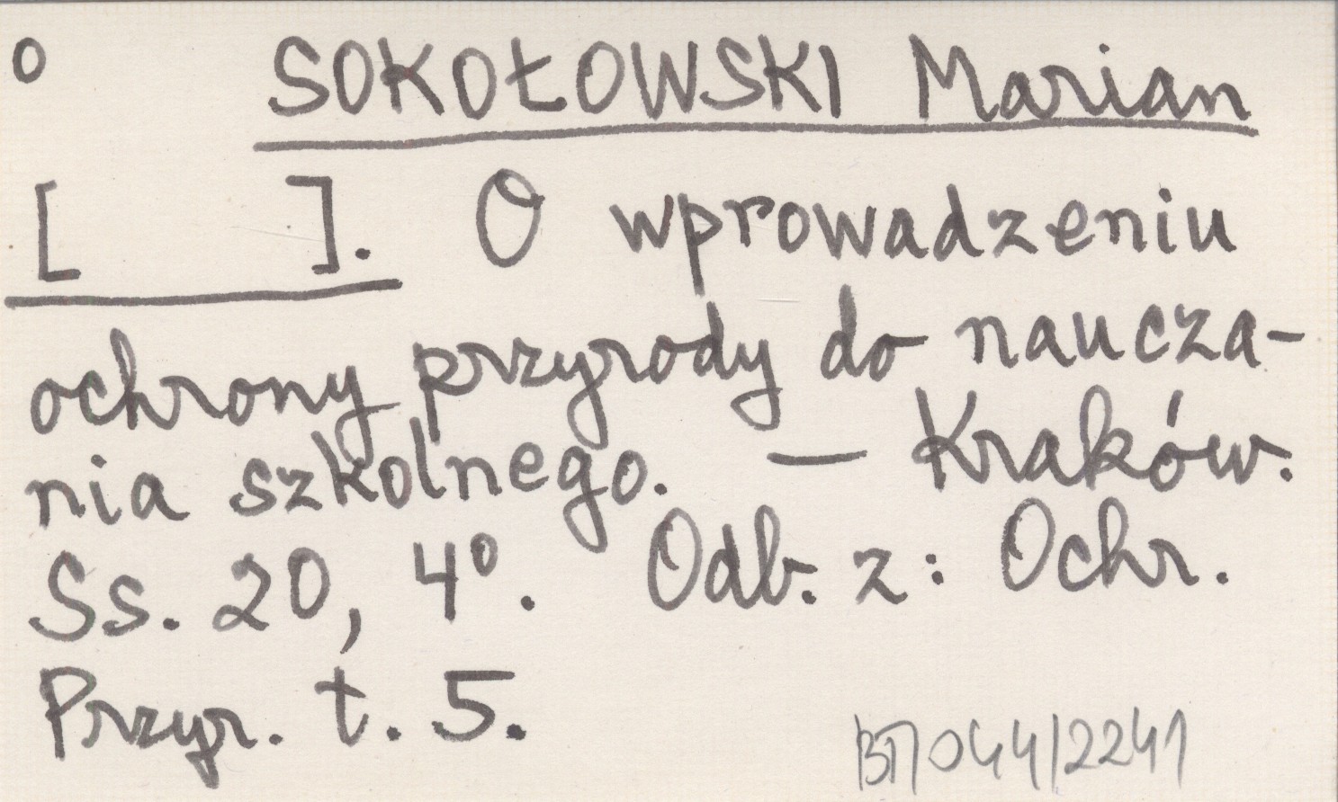 SOKOŁOWSKI Marian O wprowadzeniu ochrony przyrody do nauczania szkolnego.