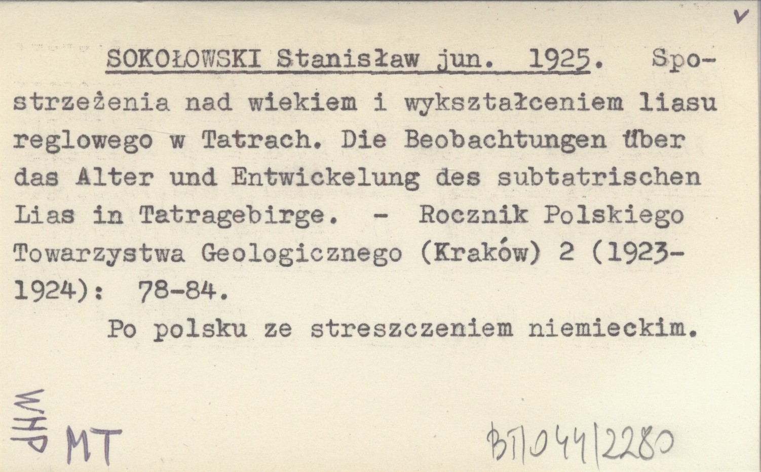 SOKOŁOWSKI Stanisław jun. 1925 Spostrzeżenia nad wiekiem i wykształceniem liasu reglowego w Tatrach. Die Beobachtungen über das Alter und Entwickelung des subtatrischen Lias in Tatragebirge.