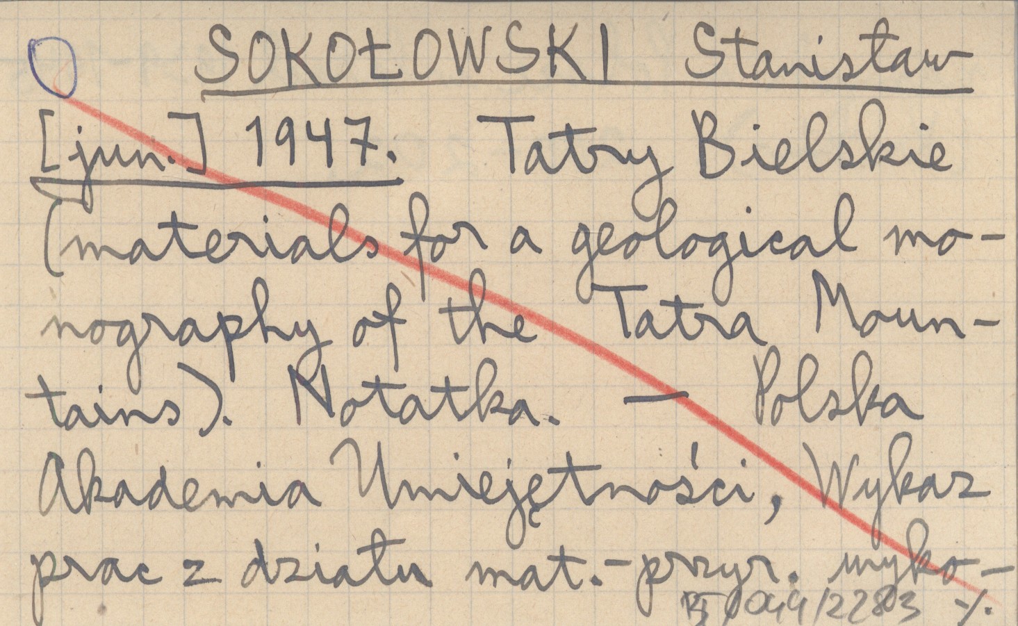 SOKOŁOWSKI Stanisław [jun.] 1947 Tatry Bielskie (materials for a geological monography of the Tatra Mountains). Notatka.