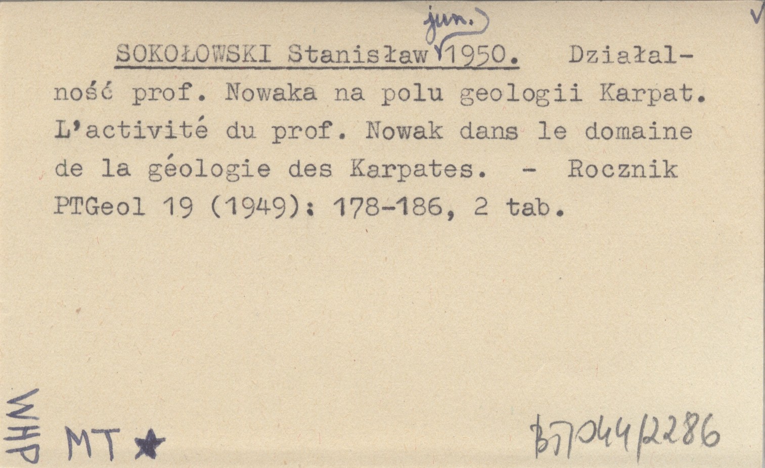 SOKOŁOWSKI Stanisław jun. 1950 Działalność prof. Nowaka na polu geologii Karpat. L'activité du prof. Nowak dans le domaine de la géologie des Karpates.