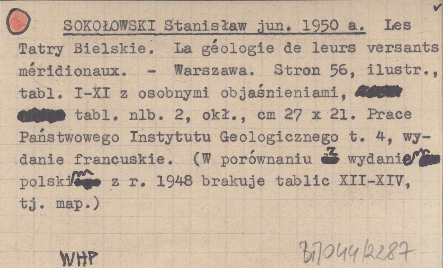 SOKOŁOWSKI Stanisław jun. 1950 a Les Tatry Bielskie. La géologie de leurs versants méridionaux.