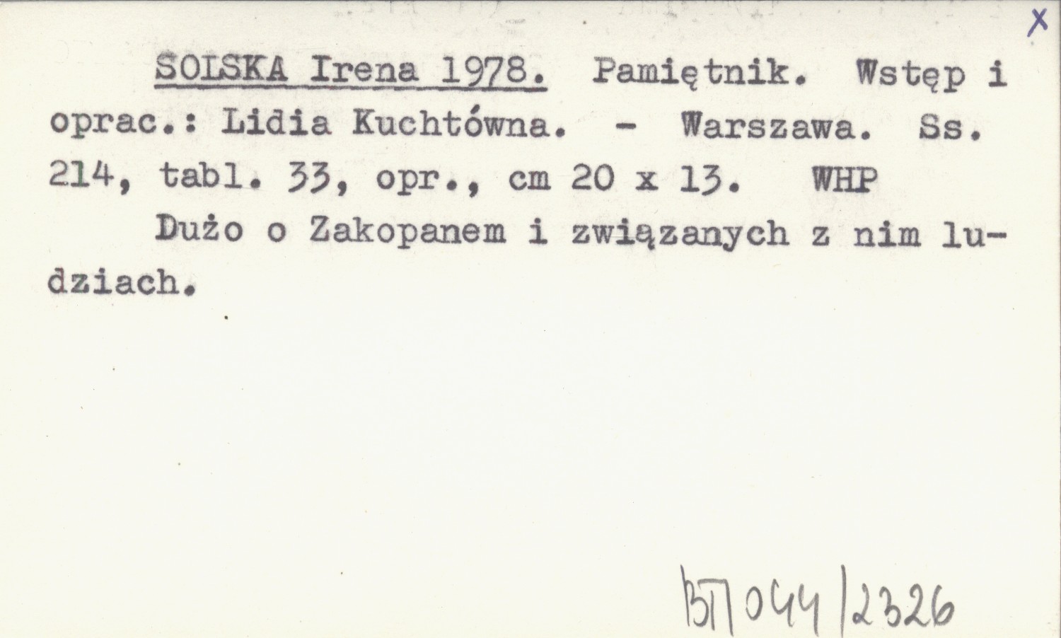 Warszawa , 214 s., 33 k., opr., 20x13 cm. Dużo o Zakopanem i związanych z nim ludziach. Wstęp i oprac.: Lidia Kuchtówna.
