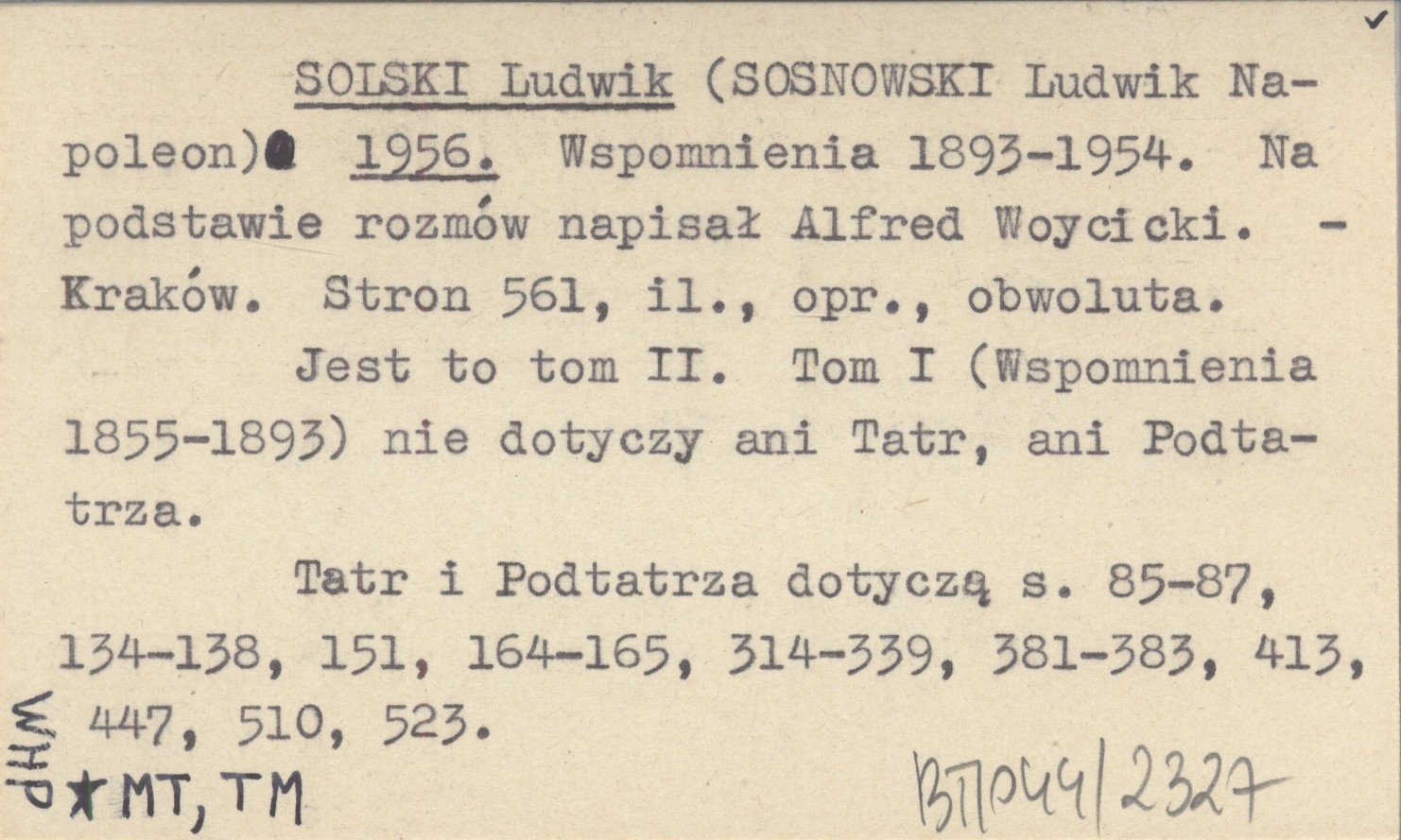 SOSNOWSKI Ludwik Napoleon SOLSKI Ludwik 1956 Wspomnienia 1893-1954. Na podstawie rozmów napisał Alfred Woycicki.