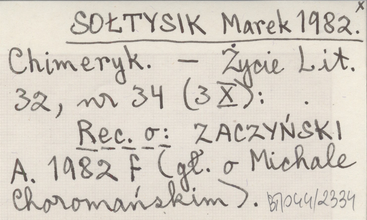 Życie Literackie, 32, nr 34 (3 X). Recenzja o: ZACZYŃSKI A. 1982 f (gł. o Michale Choromańskim).