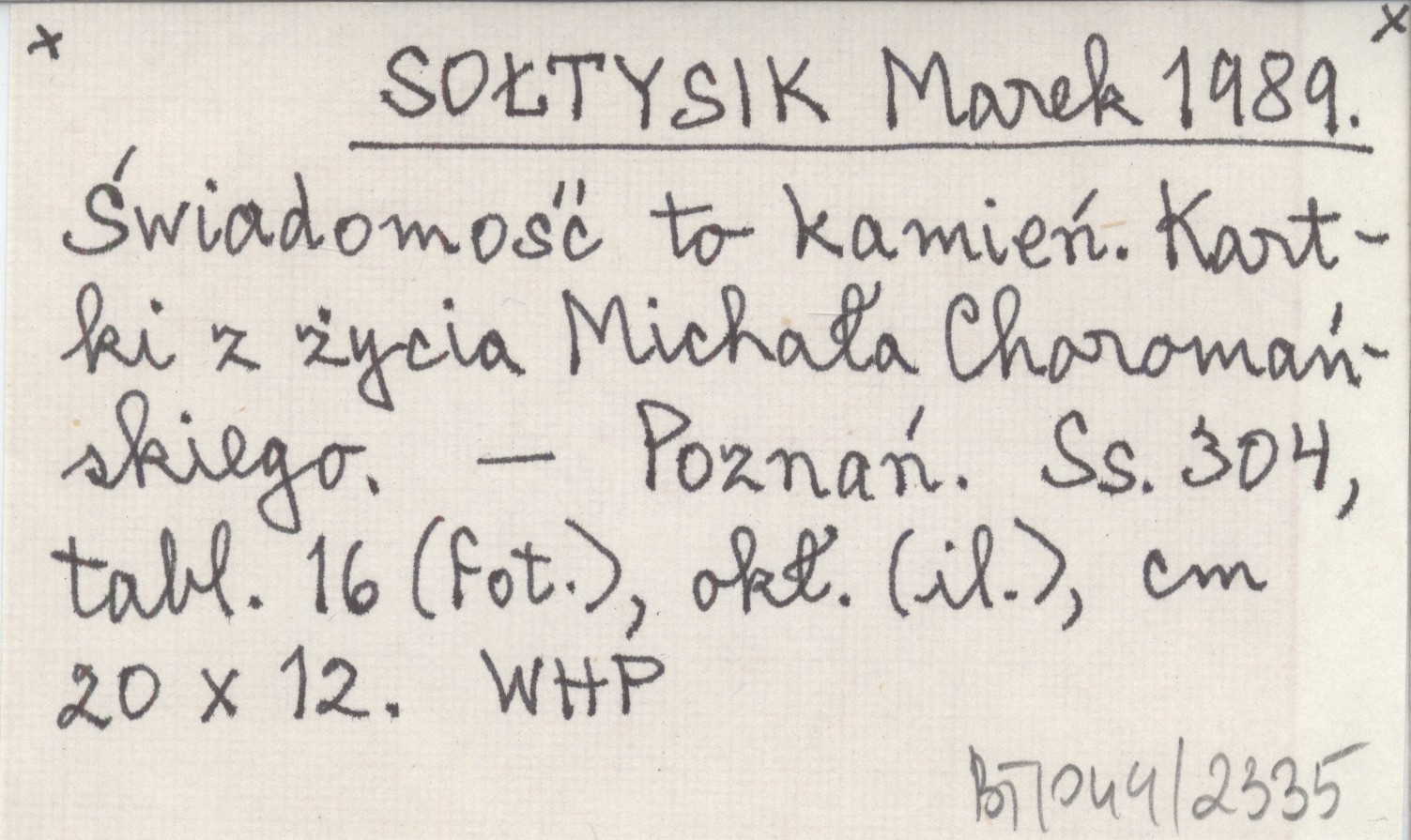 SOŁTYSIK Marek 1989 Świadomość to kamień. Kartki z życia Michała Choromańskiego.