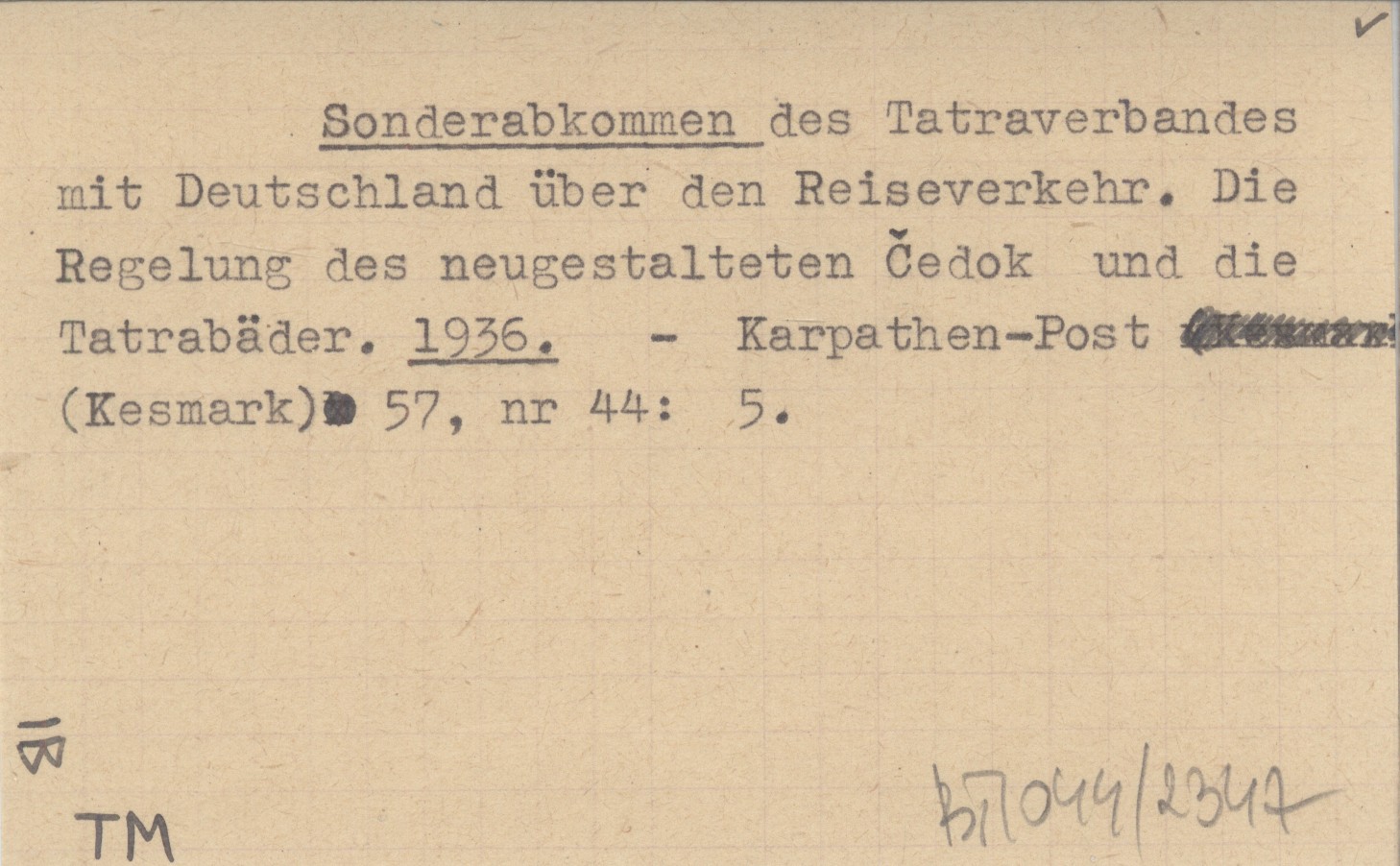 Sonderabkommen des Tatraverbandes mit Deutschland über den Reiseverkehr. Die Regelung des neugestalteten Čedok und die Tatrabäder. 1936