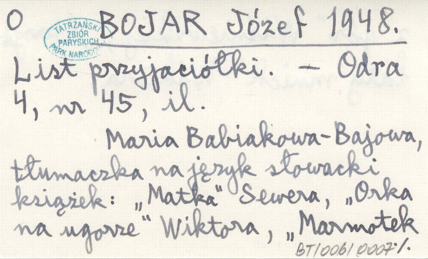 Odra, 4, nr 45, il. Maria Babiakowa-Bajowa, tłumaczka na język słowacki książek: "Matka" Sewera, "Orka na ugorze" Wiktora, "Marmotek z gór" Wiśniewskiej, "Skrzydlaty mnich" Wiktora.