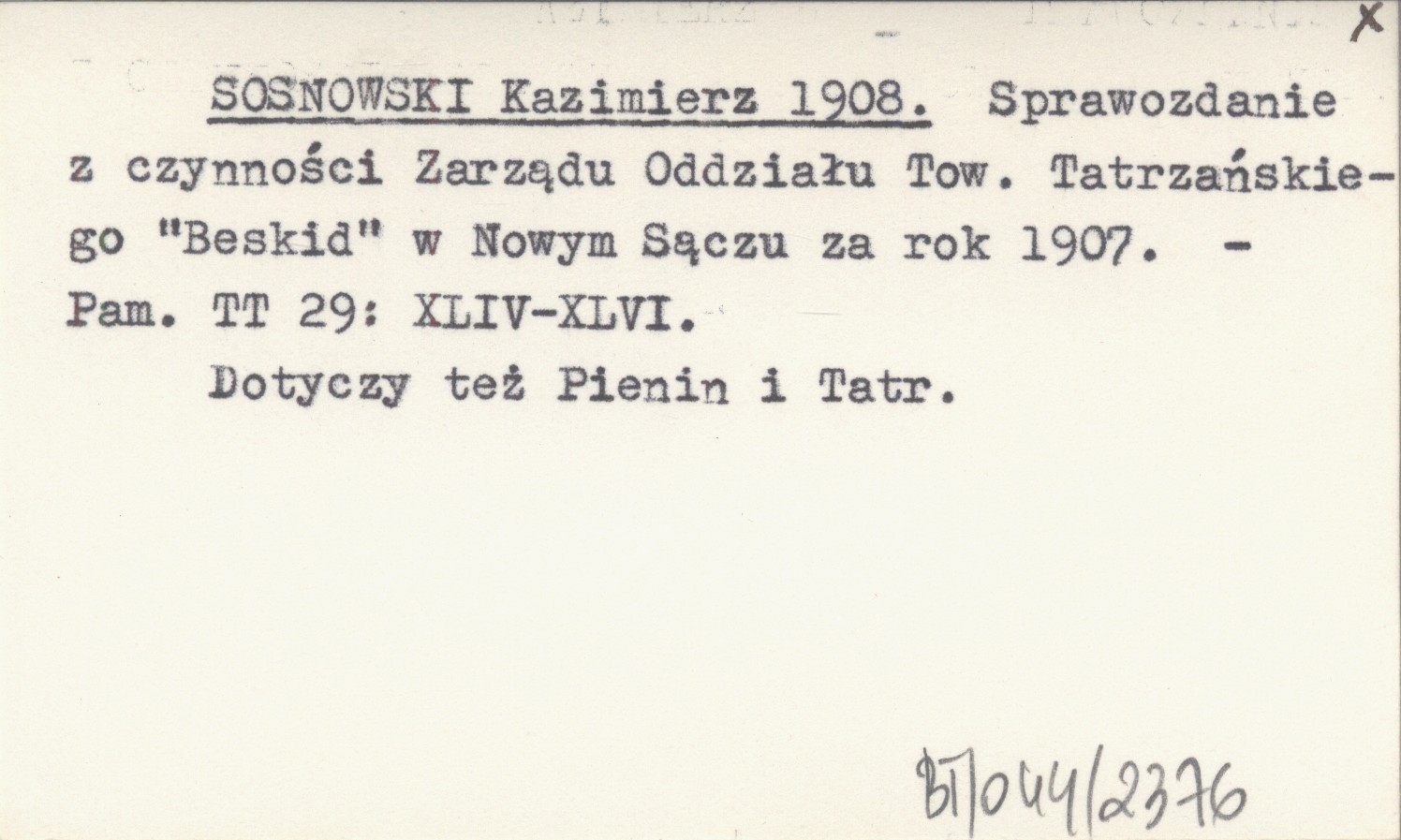 SOSNOWSKI Kazimierz 1908 Sprawozdanie z czynności Zarządu Oddziału Tow. Tatrzańskiego "Beskid" w Nowym Sączu za rok 1907.