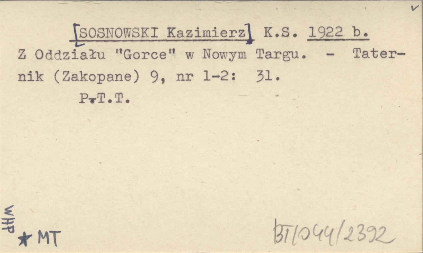 K. S. [SOSNOWSKI Kazimierz] 1922 b Z Oddziału "Gorce" w Nowym Targu.