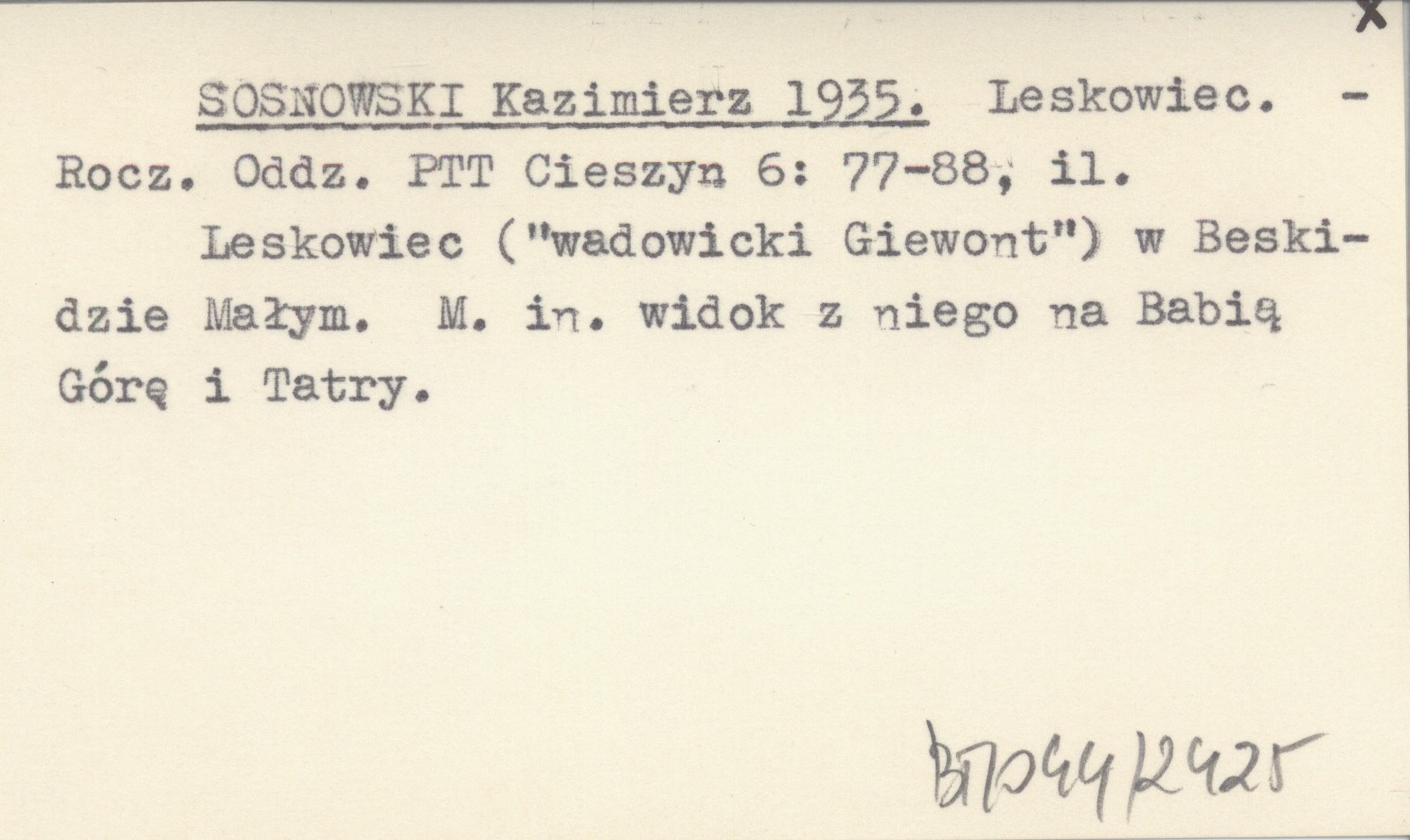 Rocznik Oddziału PTT (Cieszyn) , 6: 77-88, il. Leskowiec ("wadowicki Giewont") w Beskidzie Małym. M. in. widok z niego na Babią Górę i Tatry.
