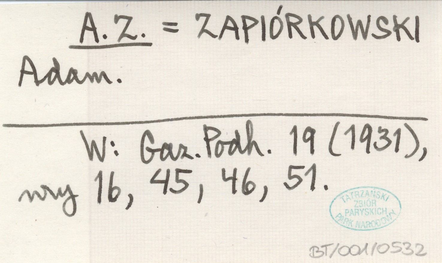 A. Z. ZAPIÓRKOWSKI Adam Gazeta Podhalańska 19 (1931), nr 16, 45, 46, 51.