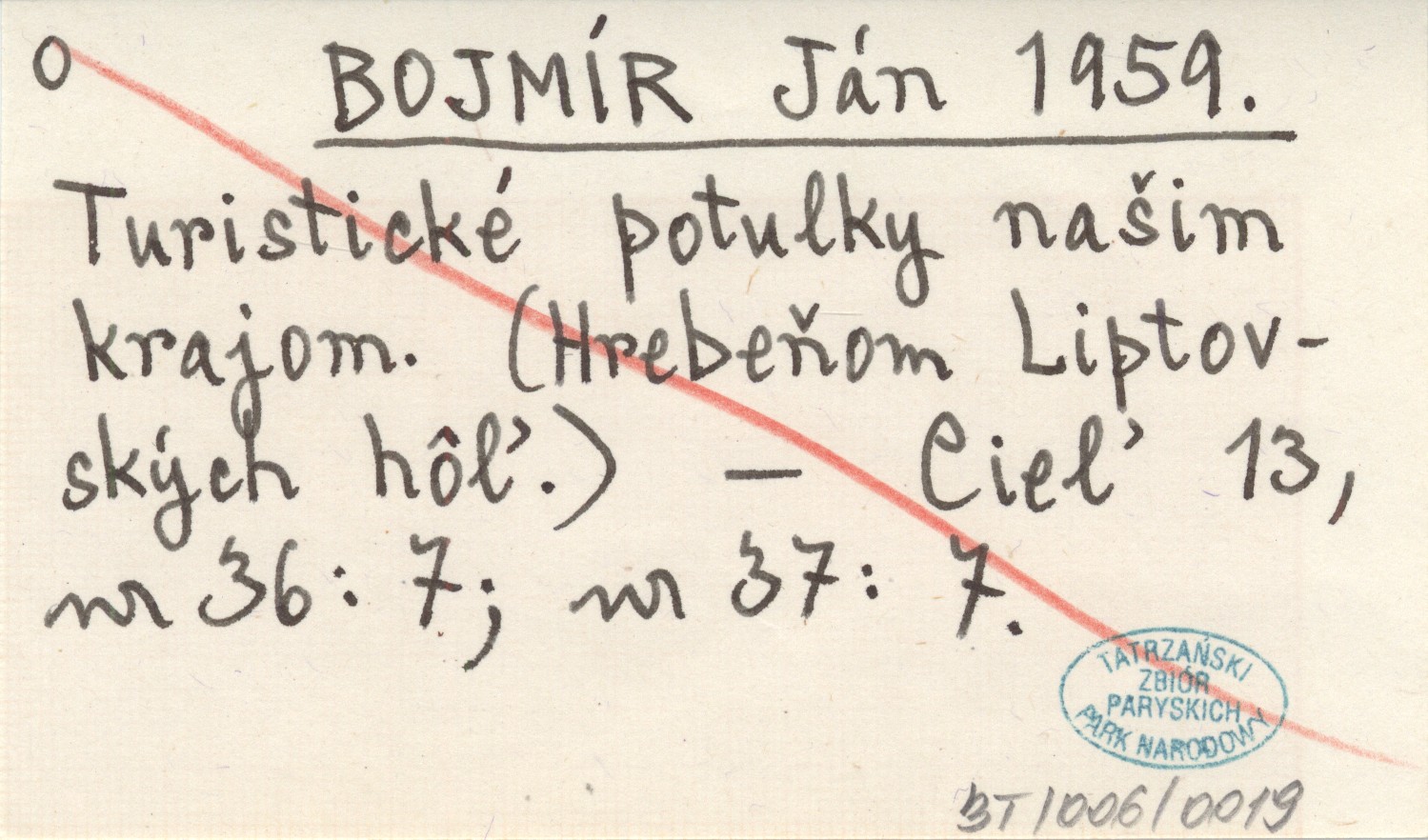 BOJMÍR Ján 1959 Turistické potulky načim krajom. (Hrebeòom Liptovskęch hô”.).