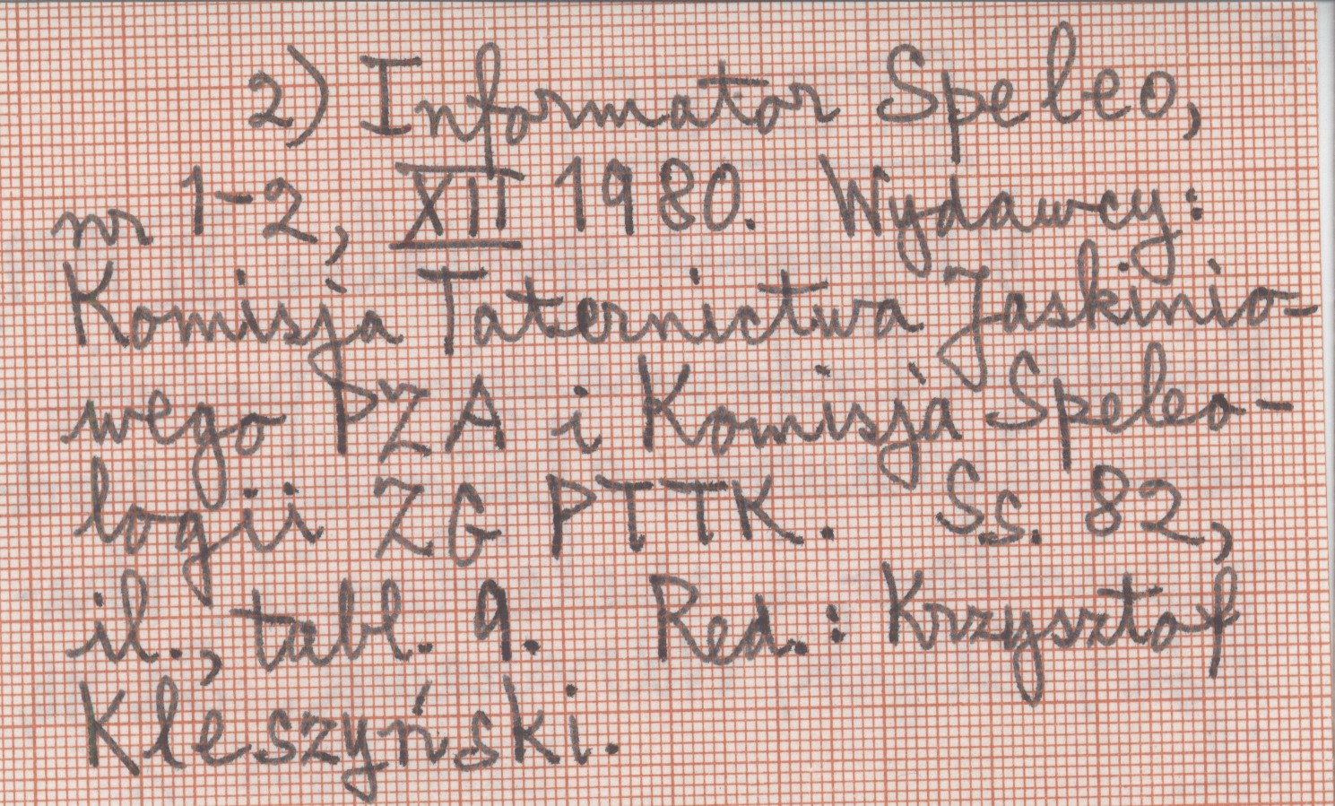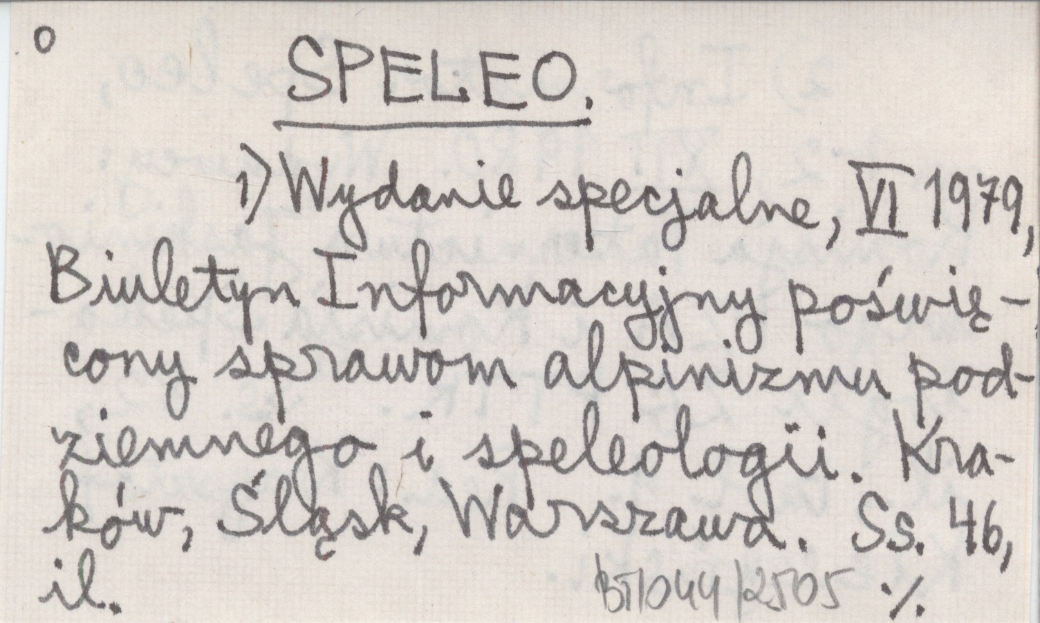 Komisja Taternictwa Jaskiniowego PZA, Komisja Speleologii ZG PTTK, SPELEO (Kraków ; Śląsk ; Warszawa ;) , 46 s., il ; nr 1-2 (XII 1980), 82 s., 9 k. 1) Wydanie specjalne, VI 1979, Biuletyn Informacyjny poświęcony sprawom alpinizmu podziemnego i speleologii.