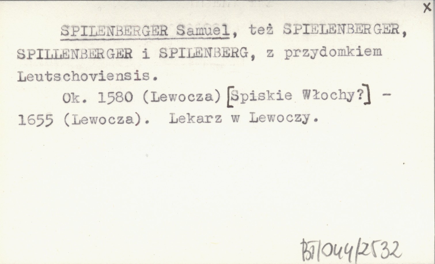 Też SPIELENBERGER, SPILLENBERGER i SPILENBERG, z przydomkiem Leutschoviensis. Ok. 1580 (Lewocza) [Spiskie Włochy?]-1655 (Lewocza). Lekarz w Lewoczy.