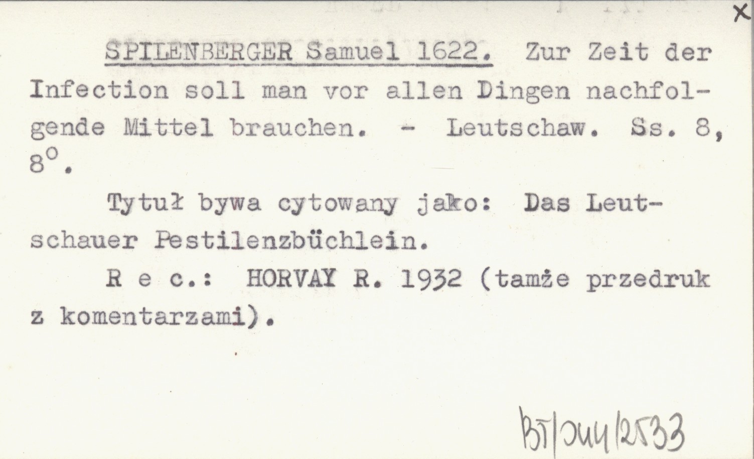 Leutschaw , 8 s., 8°. Tytuł bywa cytowany jako: Das Leutschauer Pestilenzbüchlein. REC: HORVAY R. 1932 (tamże przedruk z komentarzami).