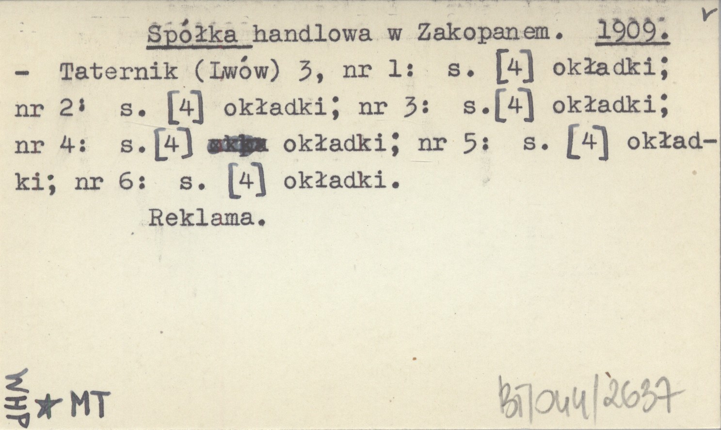 Taternik (Lwów) , 3, nr 1: [4] ; nr 2: [4] ; nr 3: [4], nr 4: [4] ; nr 5: [4] ; nr 6: [4]. Reklama.