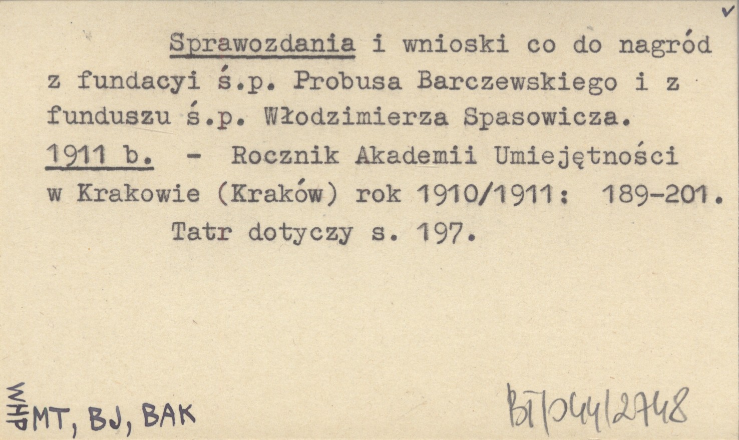 Sprawozdania i wnioski co do nagród z fundacyi ś.p. Probusa Barczewskiego i z funduszu ś.p. Włodzimierza Spasowicza. 1911 b