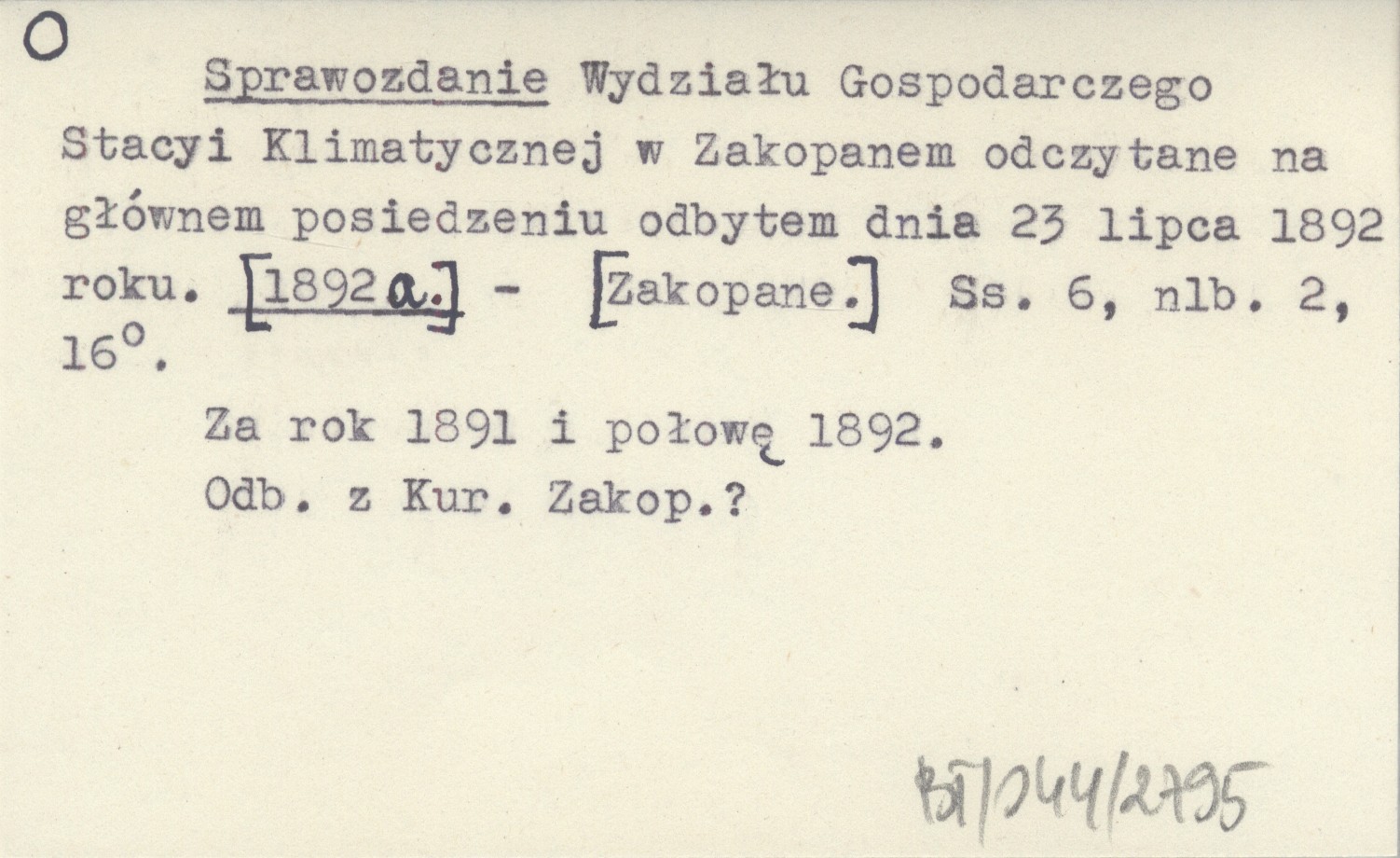 [Zakopane] , 6, [2] s., 16°. Za rok 1891 i połowę 1892. Odb. z Kuriera Zakopiańskiego?