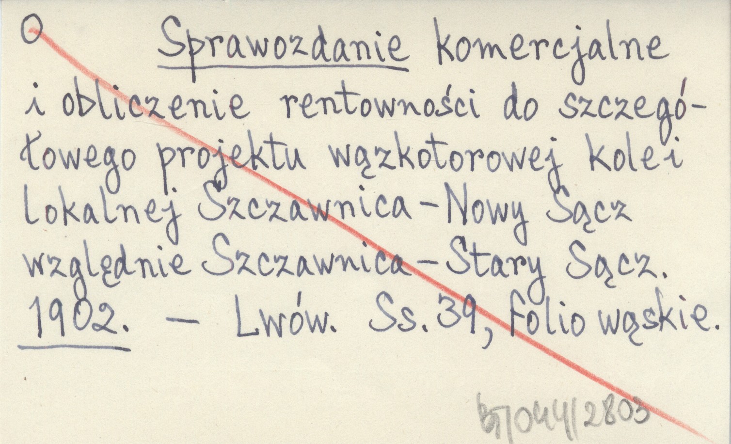Sprawozdanie komercjalne i obliczenie rentowności do szczegółowego projektu wązkotorowej kolei lokalnej Szczawnica-Nowy Sącz względnie Szczawnica-Stary Sącz. 1902