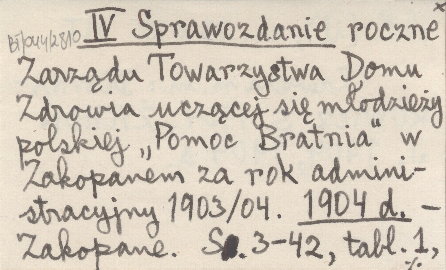 IV Sprawozdanie roczne Zarządu Towarzystwa Domu Zdrowia uczącej się młodzieży polskiej "Pomoc Bratnia" w Zakopanem za rok administracyjny 1903/04. 1904 d