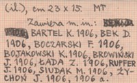 Zakopane , 48 s., 1 k., okł. (il.), 23x15 cm. Zawiera m. in.: BARTEL K. 1906, BEK D. 1906, BOCZARSKI F. 1906, BOJAKOWSKI K. 1906, BROWIŃSKI J. 1906, ŁADA Z. 1906, RUFFER J. 1906, SIUDAK M. 1906, ŻYCHOŃ J. 1906, 1906 a.