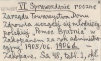 VI Sprawozdanie roczne Zarządu Towarzystwa Domu Zdrowia uczącej się młodzieży polskiej "Pomoc Bratnia" w Zakopanem za rok administracyjny 1905/06. 1906 d