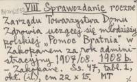 VIII Sprawozdanie roczne Zarządu Towarzystwa Domu Zdrowia uczącej się młodzieży polskiej "Pomoc Bratnia" w Zakopanem za rok administracyjny 1907/08. 1908 b