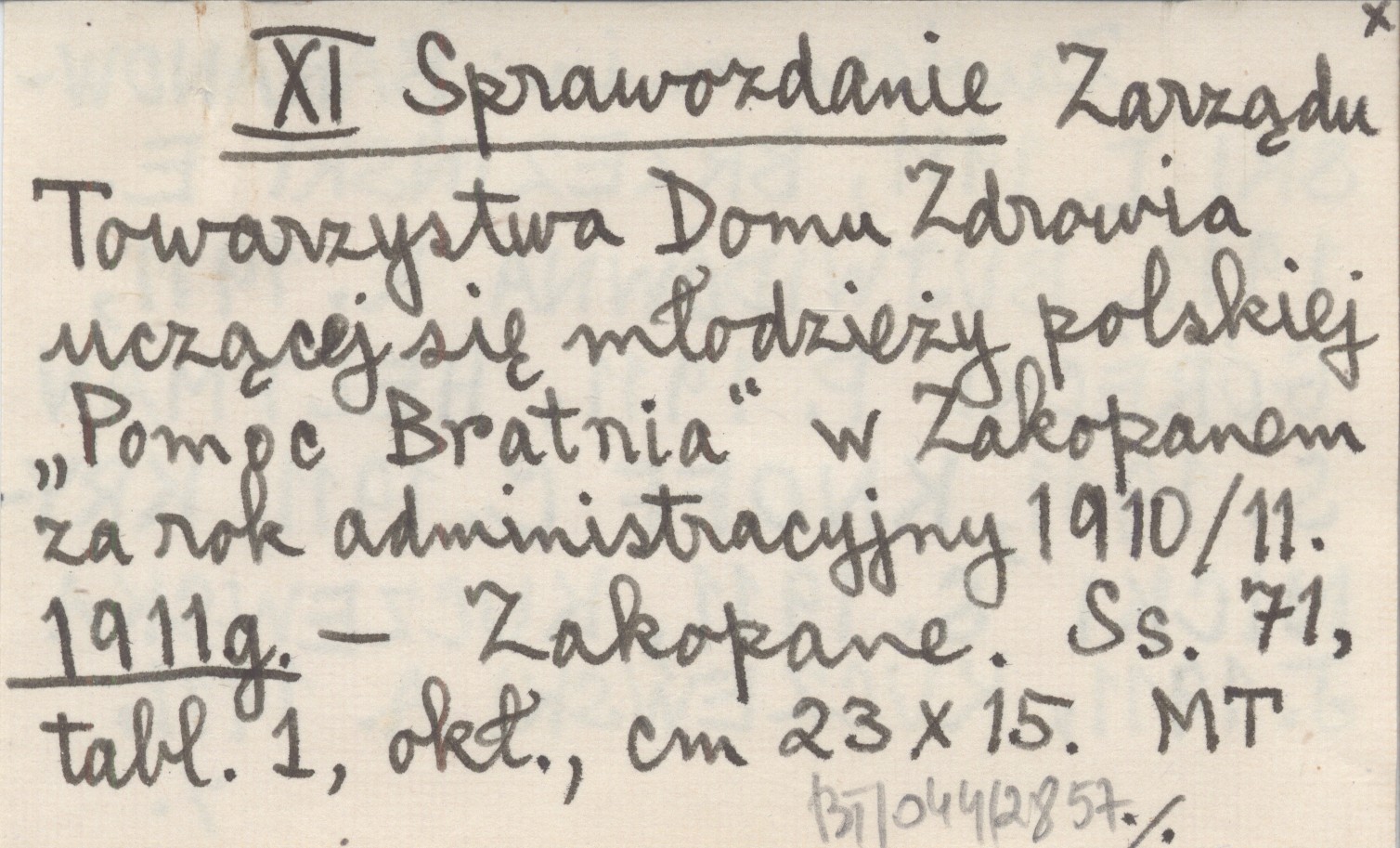 XI Sprawozdanie Zarządu Towarzystwa Domu Zdrowia uczącej się młodzieży polskiej "Pomoc Bratnia" w Zakopanem za rok administracyjny 1910/11. 1911 g