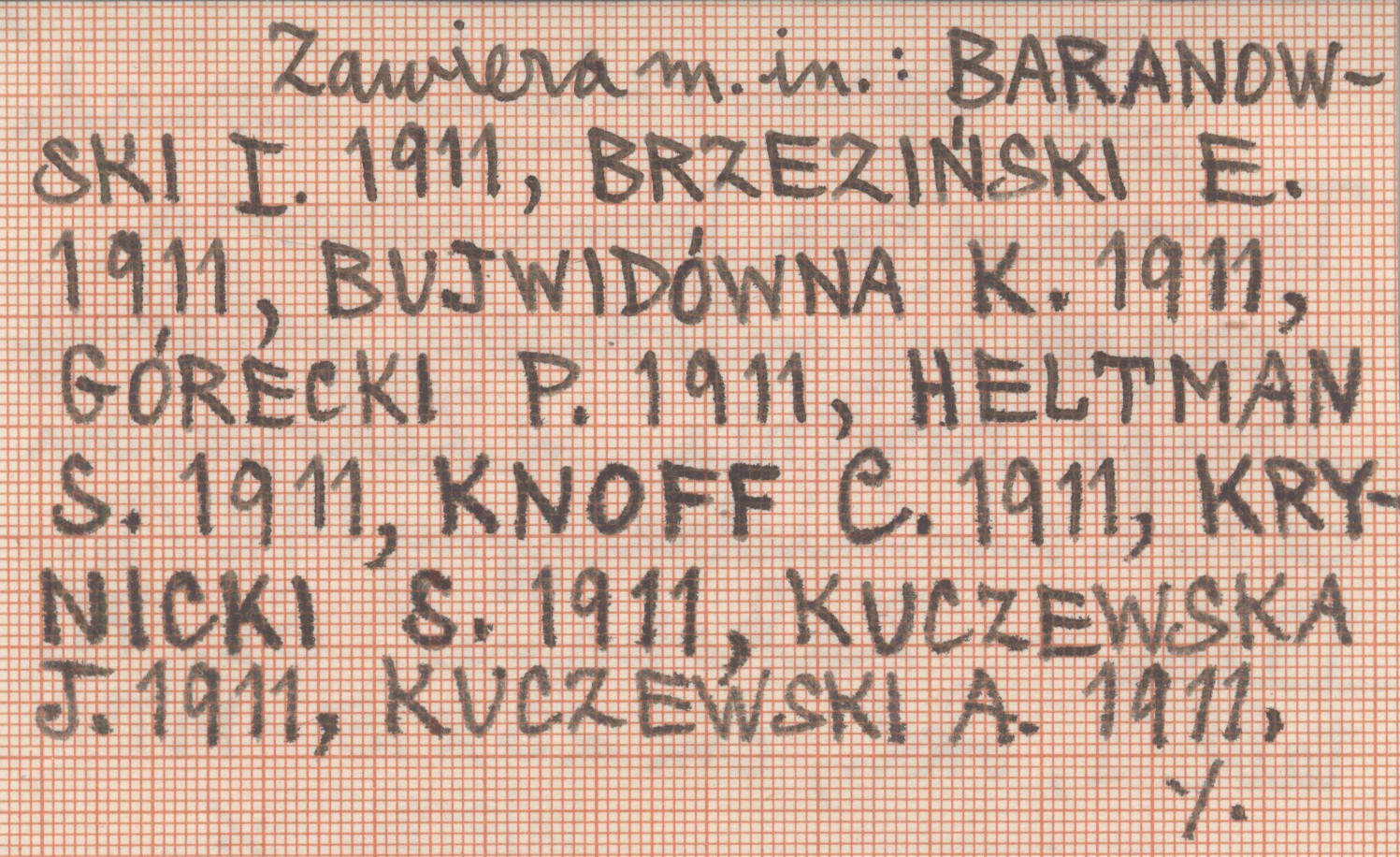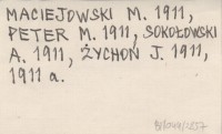 Zakopane , 71 s., 1 k., okł., 23x15 cm. Zawiera m. in. BARANOWSKI I. 1911, BRZEZIŃSKI E. 1911, BUJWIDÓWNA K. 1911, GÓRECKI P., 1911, HELTMAN S. 1911, KNOFF C. 1911, KRYNICKI S. 1911, KUCZEWSKA J. 1911, KUCZEWSKI A. 1911, MACIEJOWSKI M. 1911, PETER M. 1911, SOKOŁOWSKI A. 1911, ŻYCHOŃ J. 1911, 1911 a.