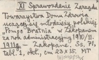 XI Sprawozdanie Zarządu Towarzystwa Domu Zdrowia uczącej się młodzieży polskiej "Pomoc Bratnia" w Zakopanem za rok administracyjny 1910/11. 1911 g