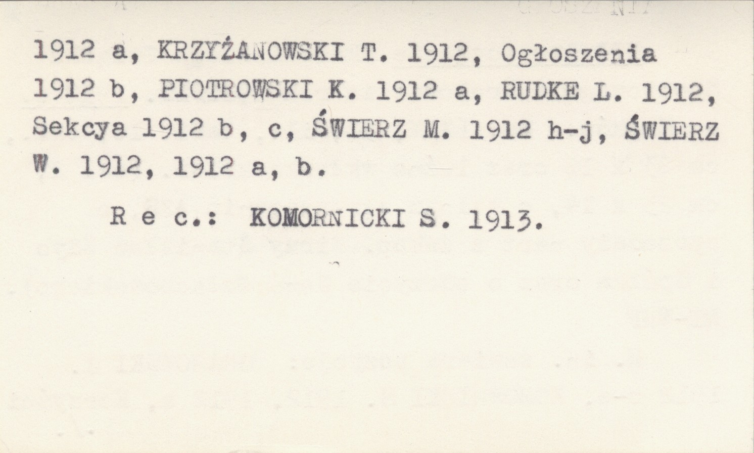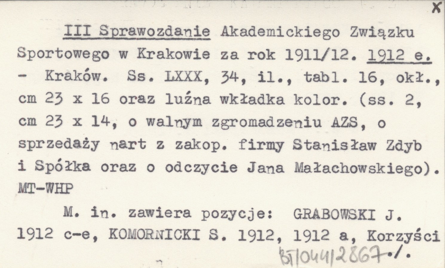 Kraków , LXXX, 34 s., il., 16 k., okł., 23x16 cm. Dodatkowo luźna wkładka kolorowa ([2] s., 23x14 cm.) o walnym zgromadzeniu AZS, o sprzedaży nart z zakopiańskiej firmy Stanisław Zdyb i Spółka oraz o odczycie Jana Małachowskiego. M. in. zawiera pozycje: GRABOWSKI J. 1912 c-e, KOMORNICKI S. 1912, 1912 a, Korzyści 1912 a, KRZYŻANOWSKI K. 1912 a, RUDKE L. 1912, Sekcya 1912 b, c, ŚWIERZ M. 1912 h-j, ŚWIERZ W. 1912, 1912 a, b. REC: KOMORNICKI S. 1913
