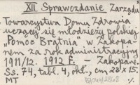 Zarządu Towarzystwa Domu Zdrowia uczącej się młodzieży polskiej "Pomoc Bratnia" w Zakopanem za rok administracyjny 1911/12.