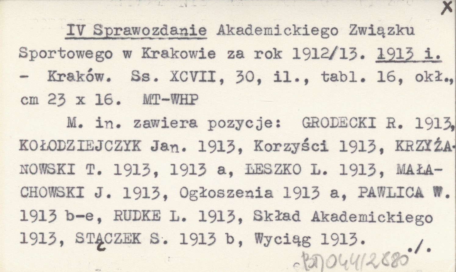 Kraków , XCVII, 30 s., il., 16 k., okł., 23x16 cm. M. in. zawiera pozycje: GRODECKI R. 1913, KOŁODZIEJCZYK Jan. 1913, Korzyści 1913, KRZYŻANOWSKI T. 1913, 1913 a, LESZKO L. 1913, MAŁACHOWSKI J. 1913, Ogłoszenia 1913 a, PAWLICA W. 1913 b-e, RUDKE L. 1913, Skład Akademickiego 1913, STĄCZEK S. 1913 b ; Wyciąg 1913. REC: GOETEL W. 1913 b