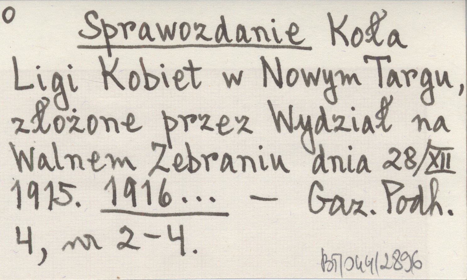 Sprawozdanie Koła Ligi Kobiet w Nowym Targu, złożone przez Wydział na Walnem Zebraniu dnia 28/XII 1915. 1916...