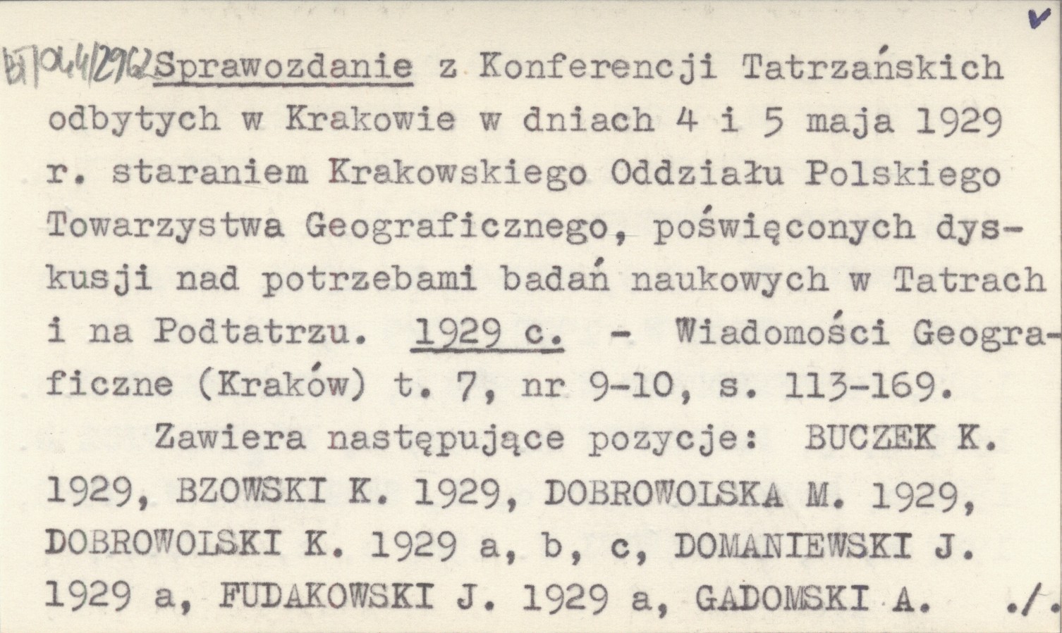 Wiadomości Geograficzne (Kraków) , T. 7, nr 9-10: 113-169. Zawiera następujące pozycje: BUCZEK K. 1929, BZOWSKI K. 1929, DOBROWOLSKA M. 1929, DOBROWOLSKI K. 1929 a, b, c, DOMANIEWSKI J. 1929 a, FUDAKOWSKI J. 1929 a, GADOMSKI A. 1929 i, j, GOETEL W. 1929 f, g, h, i, j, k, GOTKIEWICZ M. 1929 a, b, HALICKI B. 1929 a, HOŁUB-PACEWICZOWA Z. 1929, 1929 a, KOWALSKI L. 1929, 1929 a, KREUTZ S. 1929 b, c, d, e, MASLANKIEWICZ K. 1929, NITSCH K. 1929, NOWAK Jan 1929, OLSZEWICZ W. 1929, 1929 a, ORMICKI W. 1929, PASSENDORFER E. 1929 a, PAWLIKOWSKI J. G. 1929 i, j, PAWŁOWSKI B. 1929 e, PIĄTKIEWICZ B. 1929 b, ROMER E. 1929 c, d, SEMKOWICZ W. 1929, 1929 a, b, SMOLEŃSKI J. 1929 b, c.