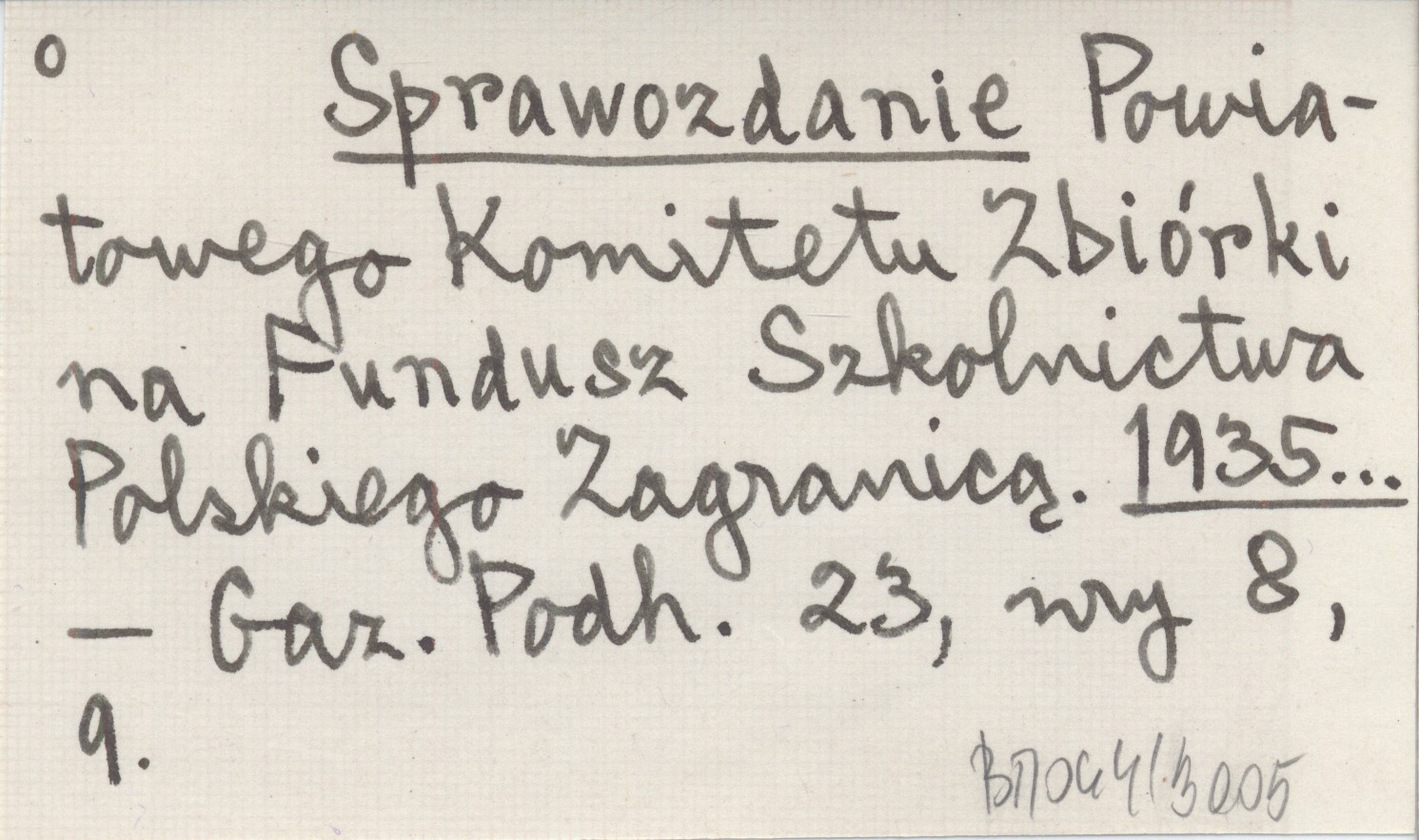 Sprawozdanie Powiatowego Komitetu Zbiórki na Fundusz Szkolnictwa Polskiego Zagranicą. 1935...